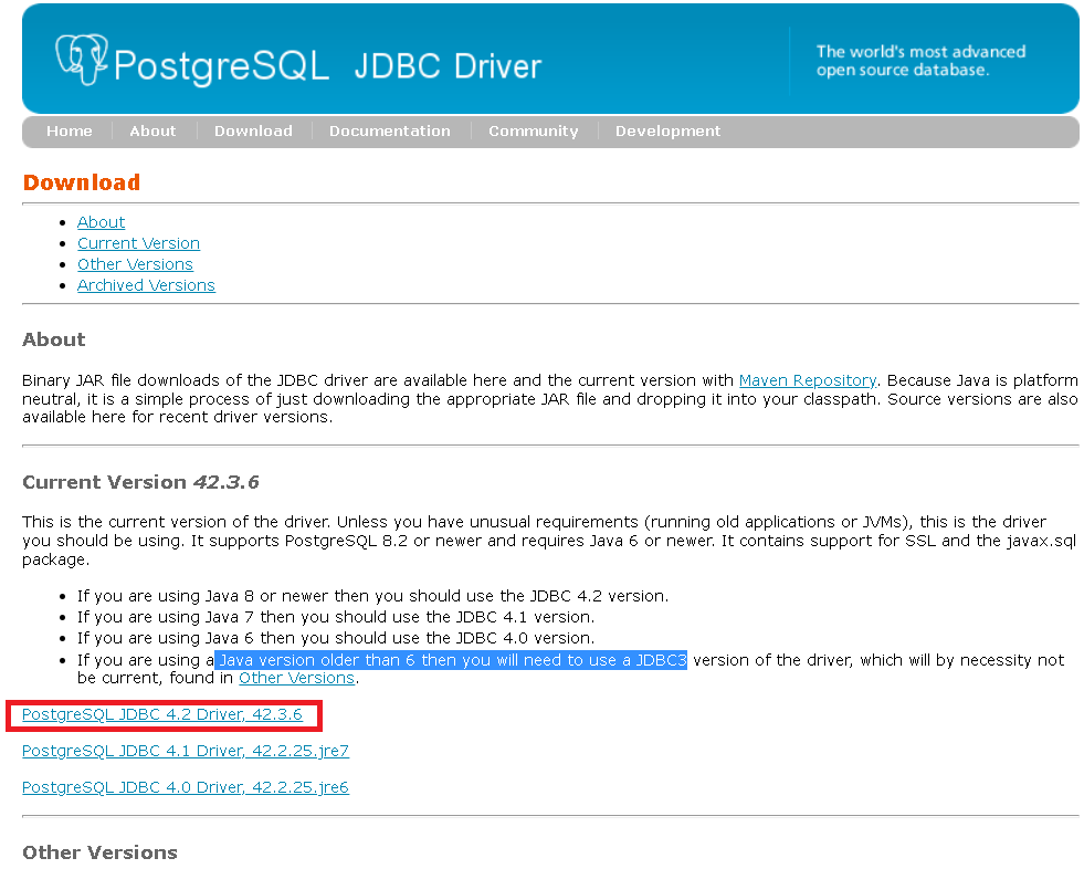 PostgreSQL JDBC Driver 42.3.6이 2022년 6월 6일자 최신 버전이다. 이 버전은 PostgreSQL 8.2 이상, Java 6 이상 환경이 필요하다.