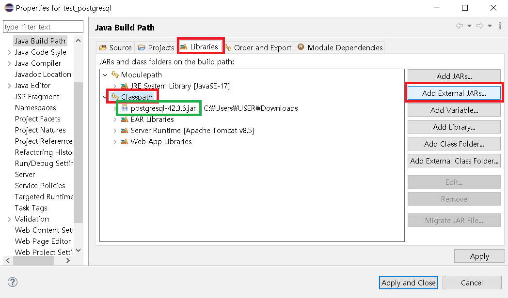 7. 'Classpath' 항목을 선택하고 'Add External JARs...' 단추를 클릭한다.