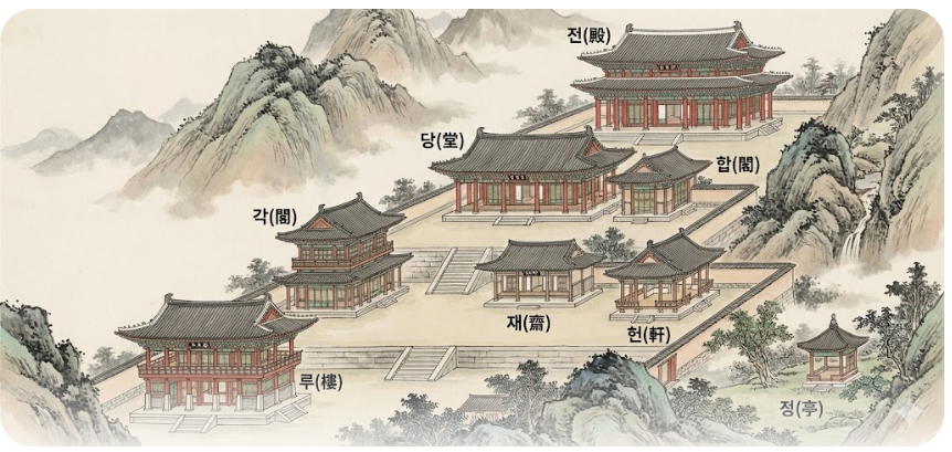 전(展), 당(堂), 합(閤), 각(閣), 재(齋), 헌(軒), 루(樓), 정(亭)